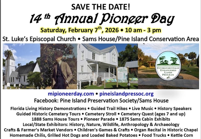 Celebrating the history of Merritt Island on “Pioneer Day” is an annual event that has an exciting appeal for history, art, music, and nature lovers, and children of all ages from 1 to 100. The ‘early’ February event is a partnership between Sams House at Pine Island and St. Luke’s Episcopal Church located on a sleepy little stretch of North Tropical Trail on North Merritt Island. From 10:00 a.m. to 3:00 p.m. the Sams House and St. Luke’s will host a wide variety of activities.