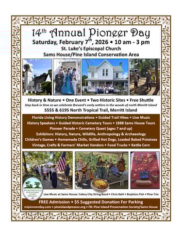 Pioneer Day is held near the birthday of John Sams, a citrus grower and the first Superintendent of Brevard County Schools. Mr. Sams built the oldest standing home in Brevard County (circa 1875). The Sams Cabin is now a museum within the 880-acre Pine Island Conservation Area, which is owned and operated by the Brevard County Environmentally Endangered Lands Program, and is co-owned by the Saint Johns River Water Management District (SJRWMD). Mr. Sams also helped to build St. Luke’s Chapel in 1888 and is buried in the church cemetery
